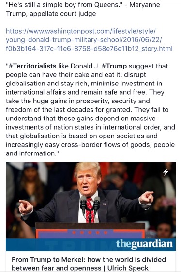 “#Territorialists like Donald J. #Trump suggest that people can have their cake and eat it: disrupt globalisation and stay rich, minimise investment in international affairs and remain safe and free. They take the huge gains in prosperity, security and freedom of the last decades for granted. They fail to understand that those gains depend on massive investments of nation states in international order, and that globalisation is based on open societies and increasingly easy cross-border flows of goods, people and information.”