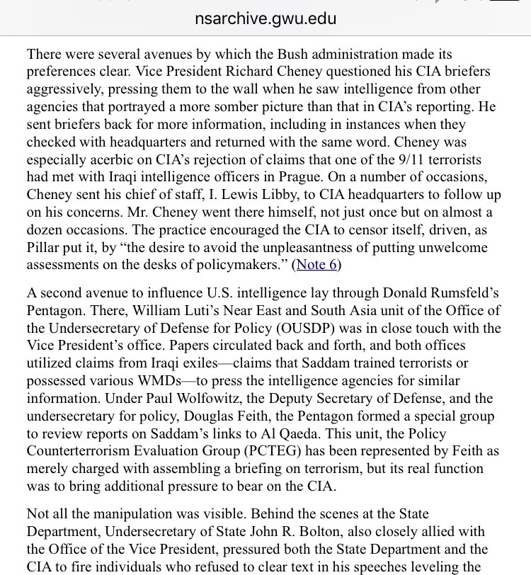 – a CIA analyst described receiving direct phone calls from Vice President Dick Cheney questioning, berating, and intimidating her for her work that made the President’s daily intelligence briefings. She reported it to her boss, the CIA requested the White House go through formal channels in commenting on intelligence reports, before Cheney backed off from calling her directly to question and berate her.